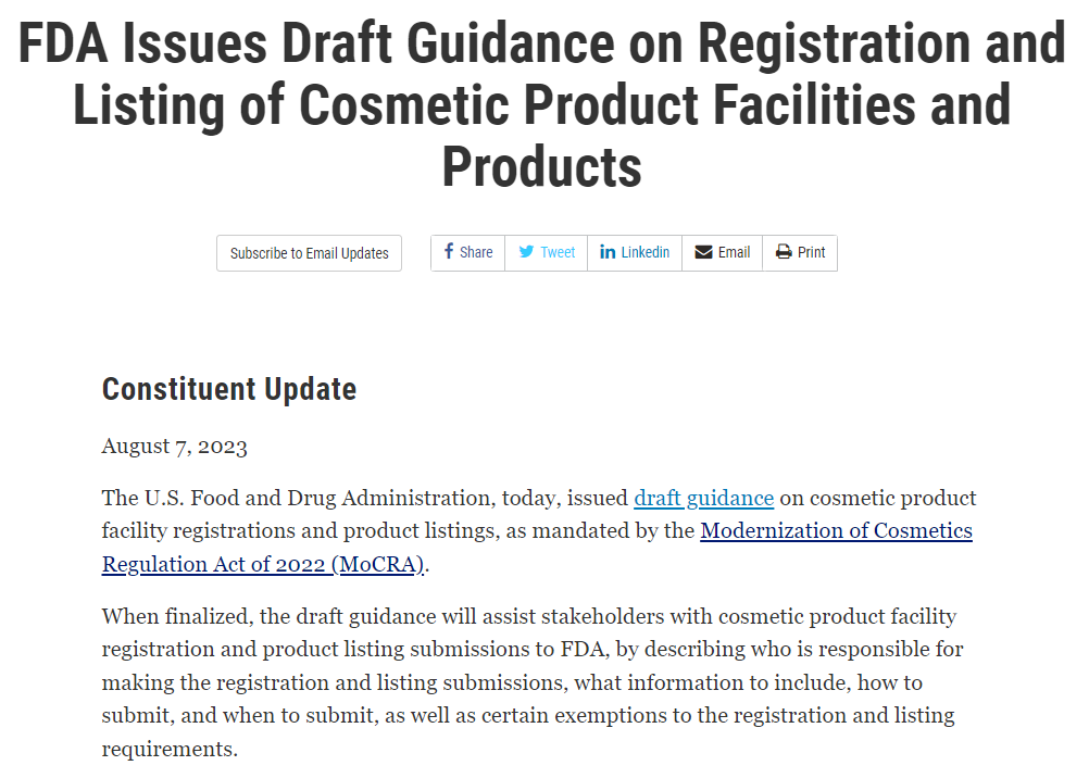 2023年8月7日,美国食品药品监督管理局(FDA)发布《化妆品设施注册和产品列名指南》草案,对《2022年化妆品法规现代化法案》(MoCRA)中设施注册和产品列名的要求做了说明。指南草案征求意见截至2023年9月7日前。
