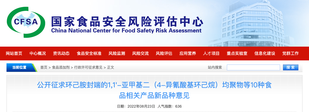 2022年8月23日,国家食品安全风险评估中心发布公开征求环己胺封端的1,1'-亚甲基二(4-异氰酸基环己烷)均聚物等10种食品相关产品新品种意见: