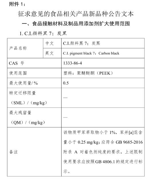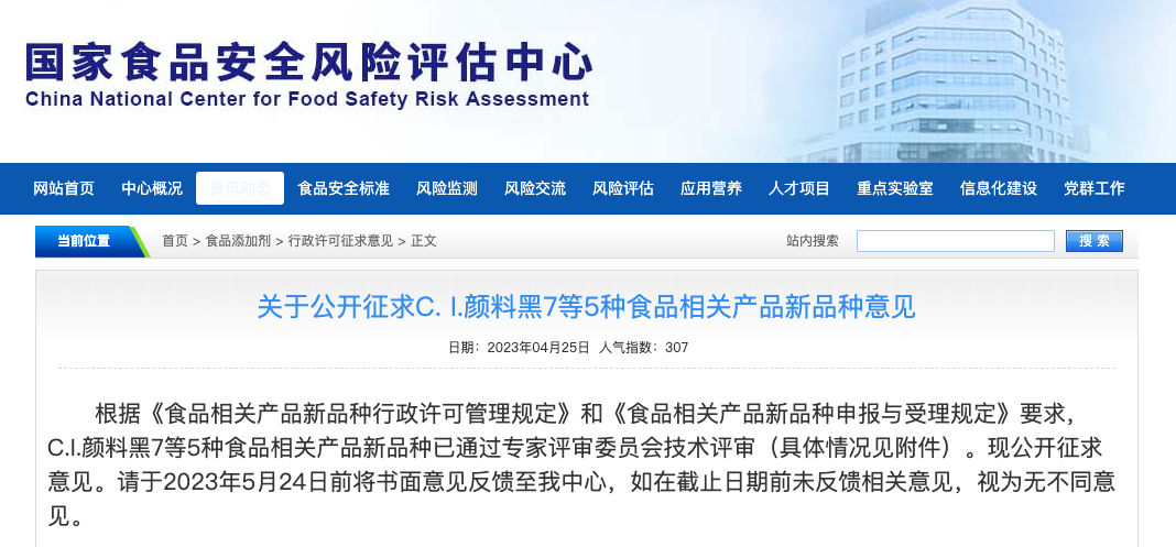 4月25日,国家食品安全风险评估中心发布了关于公开征求C.I.颜料黑7等5种食品相关产品新品种意见通知。