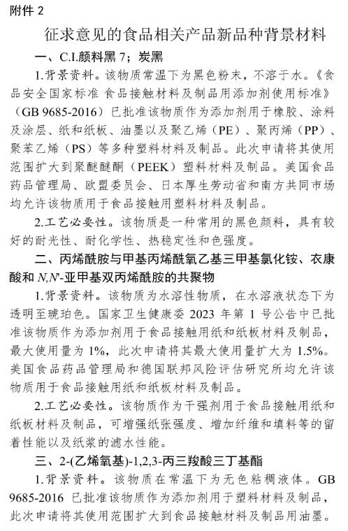根据《食品相关产品新品种行政许可管理规定》和《食品相关产品新品种申报与受理规定》要求,C.I.颜料黑7等5种食品相关产品新品种已通过专家评审委员会技术评审。现对外公开征求意见,相关利益者可于2023年5月24日前将书面意见反馈至国家食品安全风险评估中心。