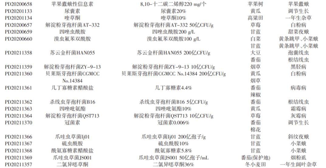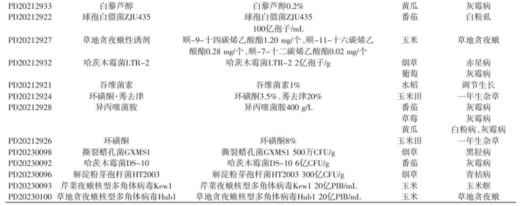 2019—2022년 우리 나라에는 신농약유효성분 43개, 제품 78개가 등록되였는데 그중 원약 (모약) 32개, 제제 46개 (표1 참조).