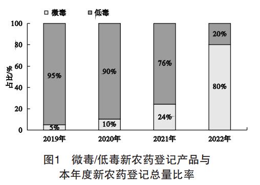 총적으로 보면 등록을 취득한 78개 신농약제품, 저독제품이 59개로 75.6% 를 차지한다.미독성 제품은 19개로 24.4% 를 차지했다.연도별로 보면 (그림 1 참조) 2019, 2020, 2021, 2022년 미독성 농약이 각각 5%, 10%, 24%, 80% 를 차지한다.이는 그해 농약 등록 종류와 밀접한 관련이 있다. 예를 들어 2022년에 등록된 5개 제품은 모두 미생물 농약이다.이는 우리 나라의 새로운 농약등록제품이 더욱 저독미독화되고 농약이 사람, 가축 및 기타 유익한 생물에 대한 위험이 대폭 낮아져 록색발전의 요구에 부합된다는것을 반영한다.
