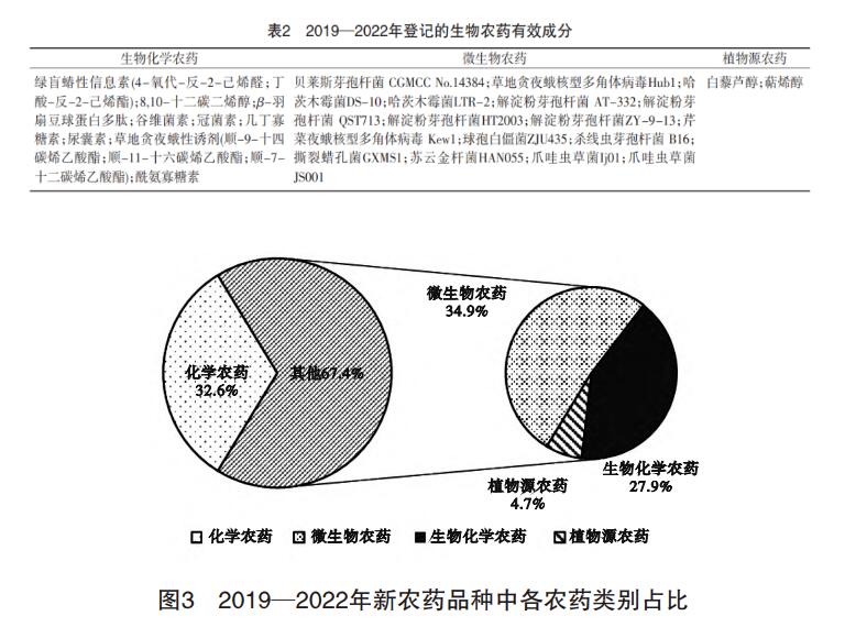 총량으로 볼 때 신농약 유효성분은 모두 43개로 그중 생물농약 29개 (생물화학농약 12개, 미생물농약 15개, 식물원농약 2개, 표2 참조), 생물농약 유효성분 수량은 신농약 유효성분 총수의 67.4% (그림3 참조), 화학농약 14개로 신농약 유효성분 총수의 32.6% 를 차지한다.새 농약 제품 78개 중 생물농약 제품은 44개 (그중 생물화학농약 14개, 미생물농약 26개, 식물원농약 4개) 로 56.4% 를 차지해 절반을 넘었다.연도별로 보면 화학농약제품의 등록이 해마다 낮아지고 생물농약제품의 등록이 해마다 제고되고있다 (그림4 참조). 그중 2022년에 등록을 받은 신농약제품은 모두 생물농약이다.우리나라의 생물농약 등록 장려 정책이 뚜렷한 성과를 거두었음을 나타낸다.