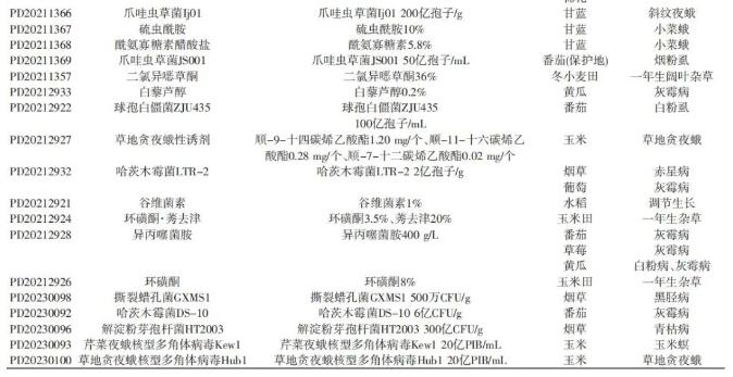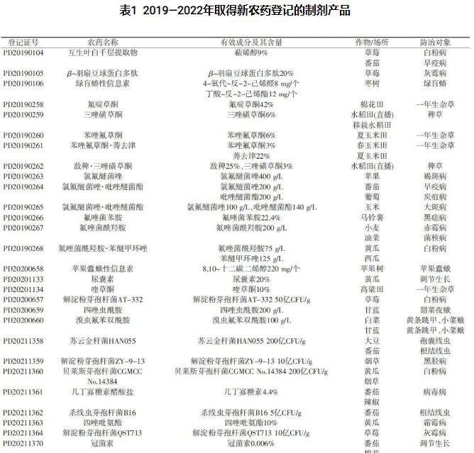 2019—2022년 우리 나라에는 신농약유효성분 43개, 제품 78개가 등록되였는데 그중 원약 (모약) 32개, 제제 46개 (표1 참조).