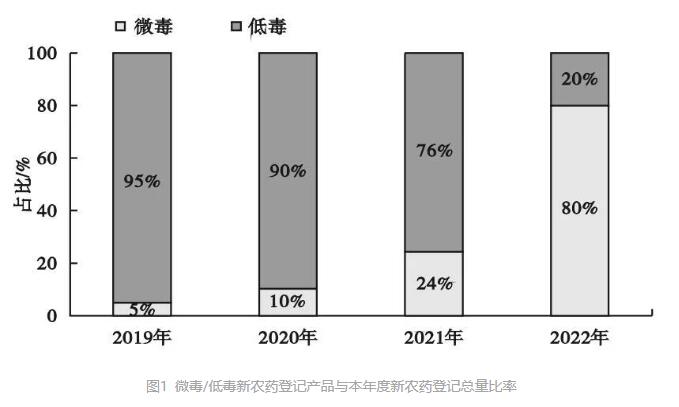 전체적으로 보면 등록을 취득한 78개 신농약 제품 중 저독성 제품이 59개로 75.6% 를 차지한다.미독성 제품은 19개로 24.4% 를 차지했다.연도별로 보면 (그림 1 참조) 2019, 2020, 2021, 2022년 미독성 농약이 각각 5%, 10%, 24%, 80% 를 차지한다.이는 그해 농약 등록 종류와 밀접한 관련이 있다. 예를 들어 2022년에 등록된 5개 제품은 모두 미생물 농약이다.이는 우리 나라의 새로운 농약등록제품이 더욱 저독미독화되고 농약이 사람, 가축 및 기타 유익한 생물에 대한 위험이 대폭 낮아져 록색발전의 요구에 부합된다는것을 반영한다.