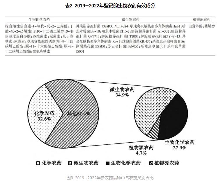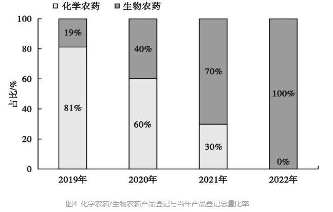 총량으로 볼 때 신농약 유효성분은 모두 43개로 그중 생물농약 29개 (생물화학농약 12개, 미생물농약 15개, 식물원농약 2개, 표2 참조), 생물농약 유효성분 수량은 신농약 유효성분 총수의 67.4% (그림3 참조), 화학농약 14개로 신농약 유효성분 총수의 32.6% 를 차지한다.새 농약 제품 78개 중 생물농약 제품은 44개 (그중 생물화학농약 14개, 미생물농약 26개, 식물원농약 4개) 로 56.4% 를 차지해 절반을 넘었다.연도별로 보면 화학농약제품의 등록이 해마다 낮아지고 생물농약제품의 등록이 해마다 제고되고있다 (그림4 참조). 그중 2022년에 등록을 받은 신농약제품은 모두 생물농약이다.우리나라의 생물농약 등록 장려 정책이 뚜렷한 성과를 거두었음을 나타낸다.