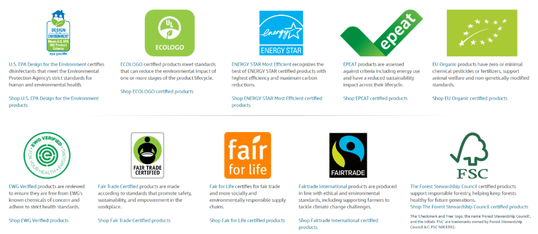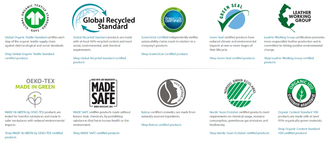 每个认证对应的产品不同,卖家只要获得其中一个认证,就能获得亚马逊气候承诺友好认证的绿标资格。